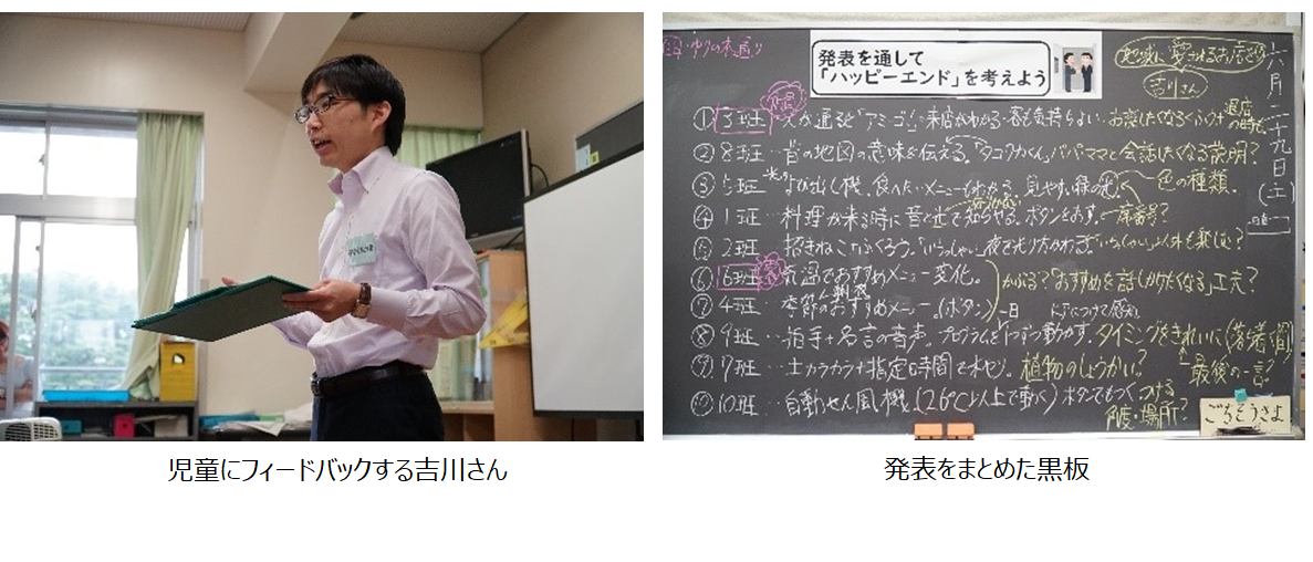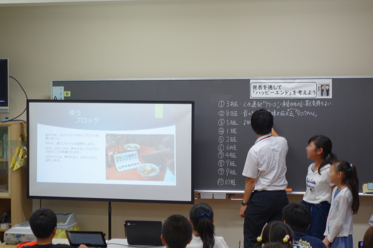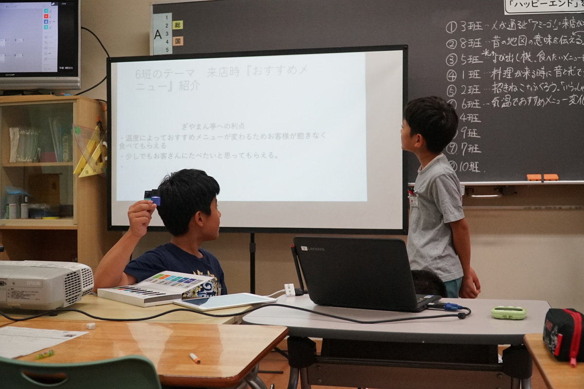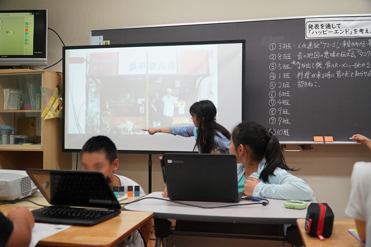 - この学習を通して、子供たちはぎやまん亭のパパさん、ママさんと会うとすぐに「アミーゴ!」と握手してつながっている姿が見られました。こうした地域の人と人をつなぐあたたかいプログラミング教育の実践ができたことに確かな手応えを感じました。