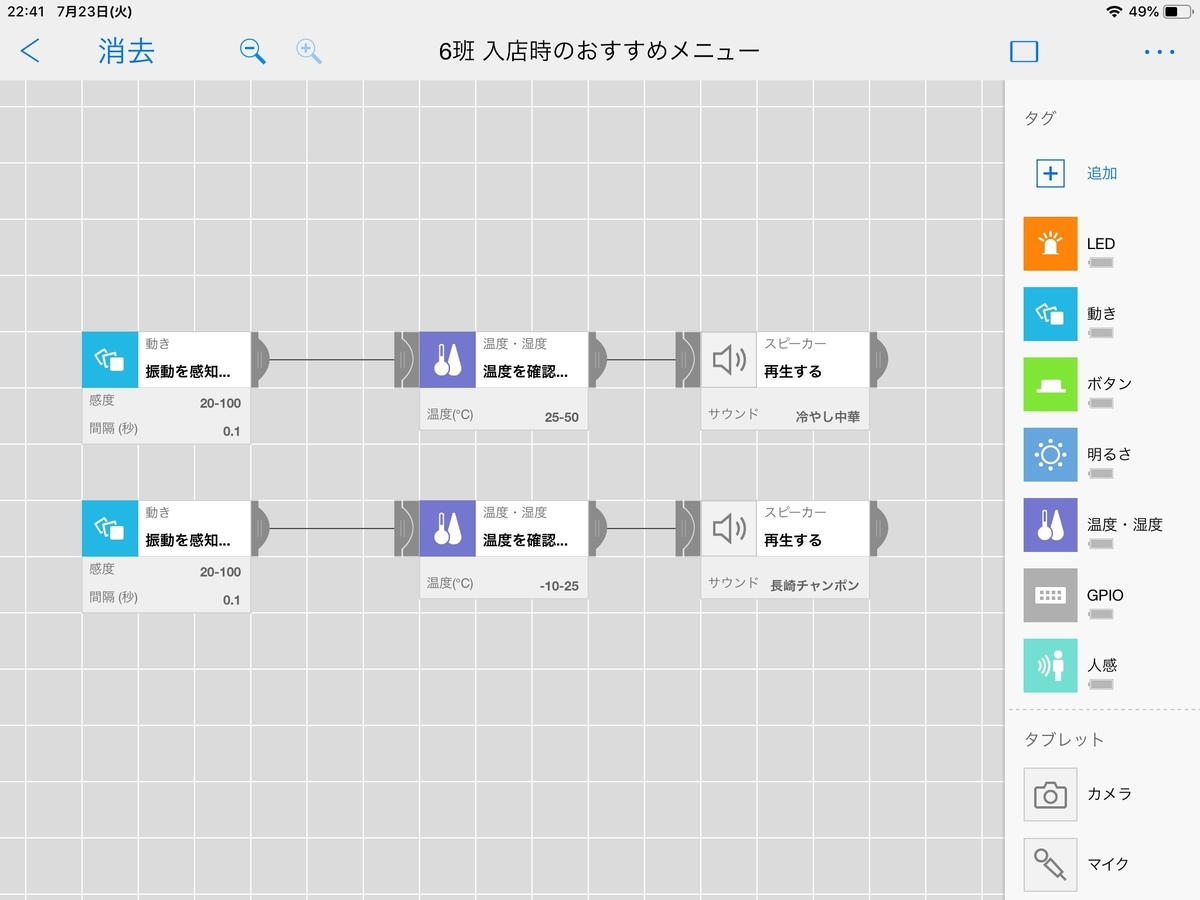 ドアに動きブロックと温度・湿度ブロックを設置。ドアが開くとその時の温度によって