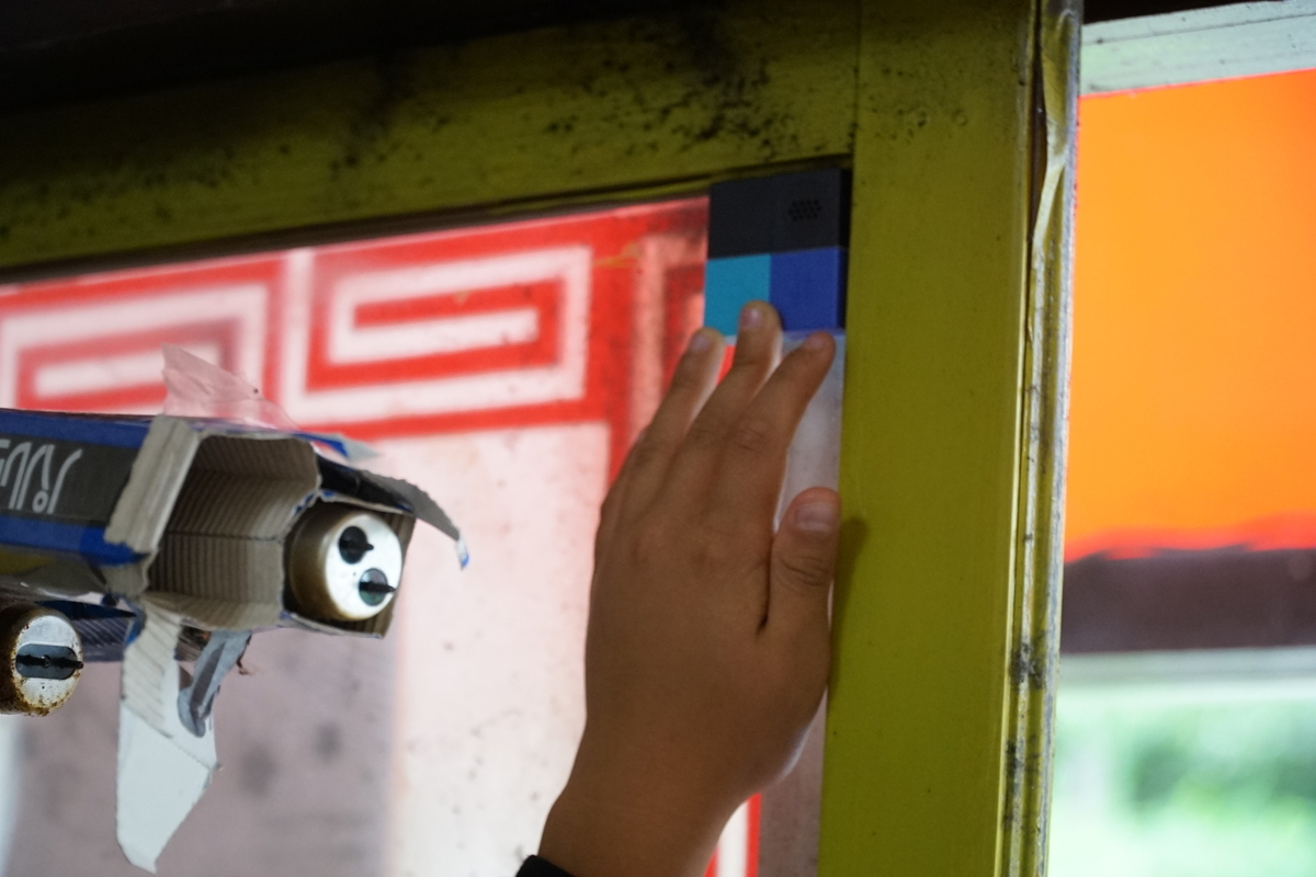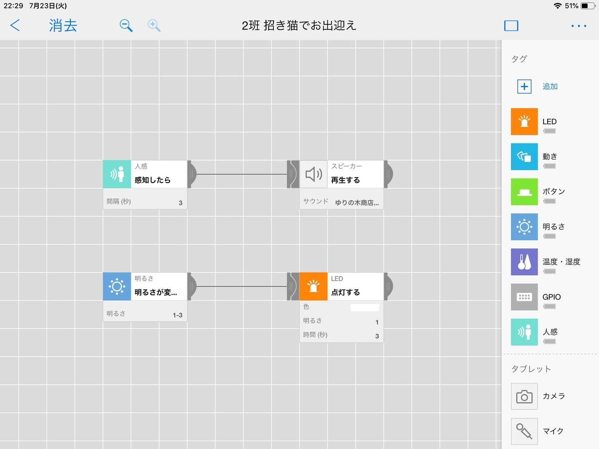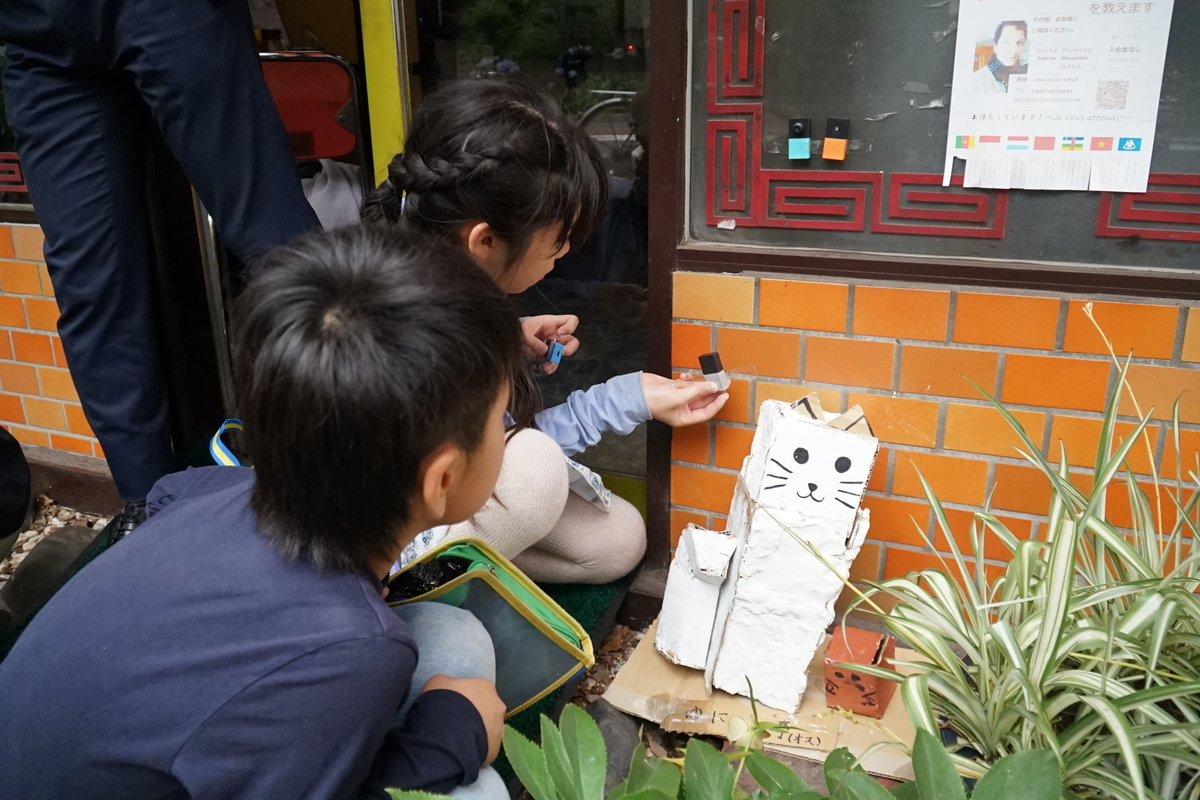 箱と紙粘土を使い、まねき猫を工作。人が通ると人感センサーが反応し「ゆりの木商店街はみんなから愛される商店街です。楽しいですよ!」と録音した音声が軽快に流れる。明るさブロックとLEDブロックも設置し、暗くなるとLEDブロックが光る演出を追加。
