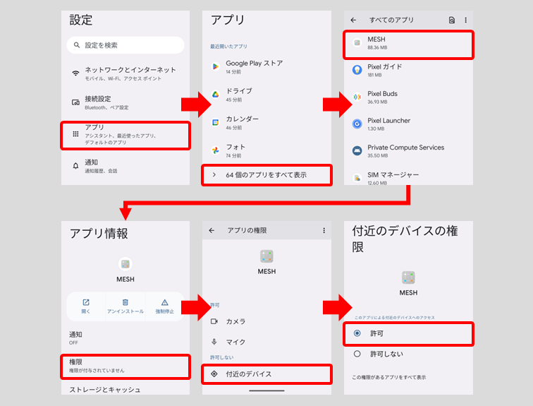 アプリの権限設定によって、MESHブロックに接続できない場合があります。その場合は、以下の設定をお試しください。