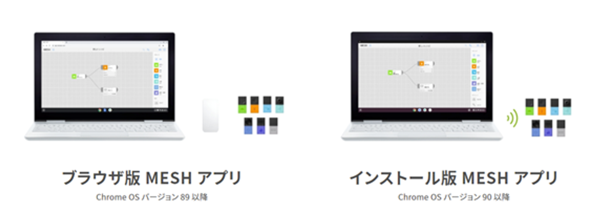 Chromebook で MESH を利用する方法として、ブラウザからアクセスして利用できるブラウザ版 MESH アプリと、Google Play からインストールできる MESH アプリの2つを用意しています。